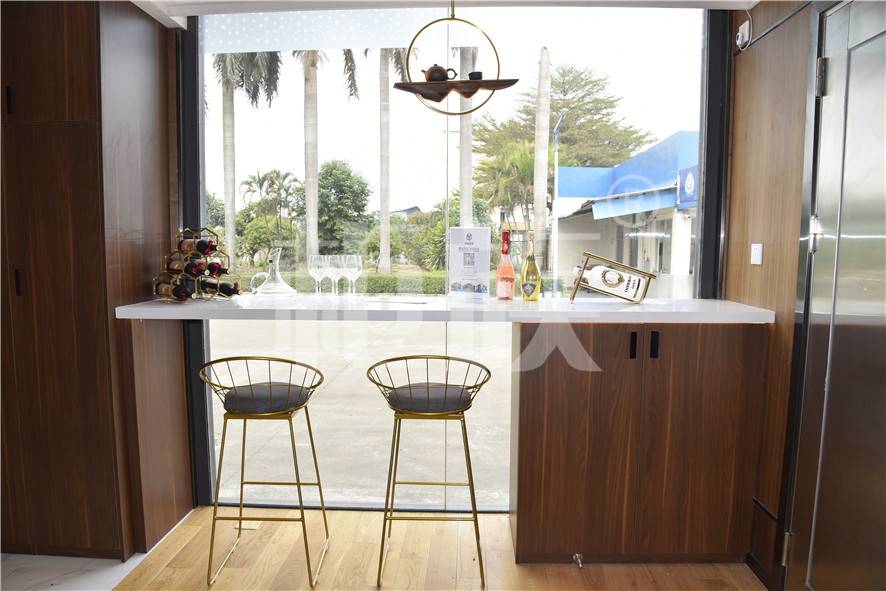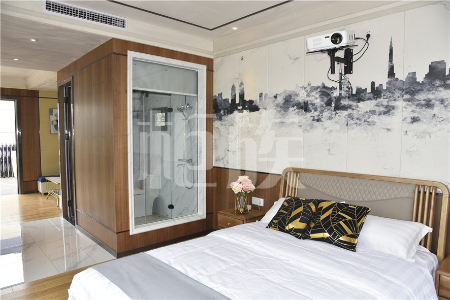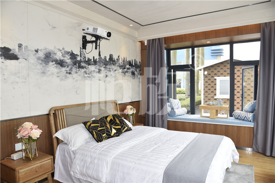 功能布局:入戶臺階,箱子整體抬高,前廳設吧臺和茶幾,樓面為隱藏式升降床,中部為衣柜、洗手臺及衛生間,臥室內帶飄窗陽臺,配影音系統。大面積落地玻璃窗,適合觀景。設計用途為景區特色民宿。